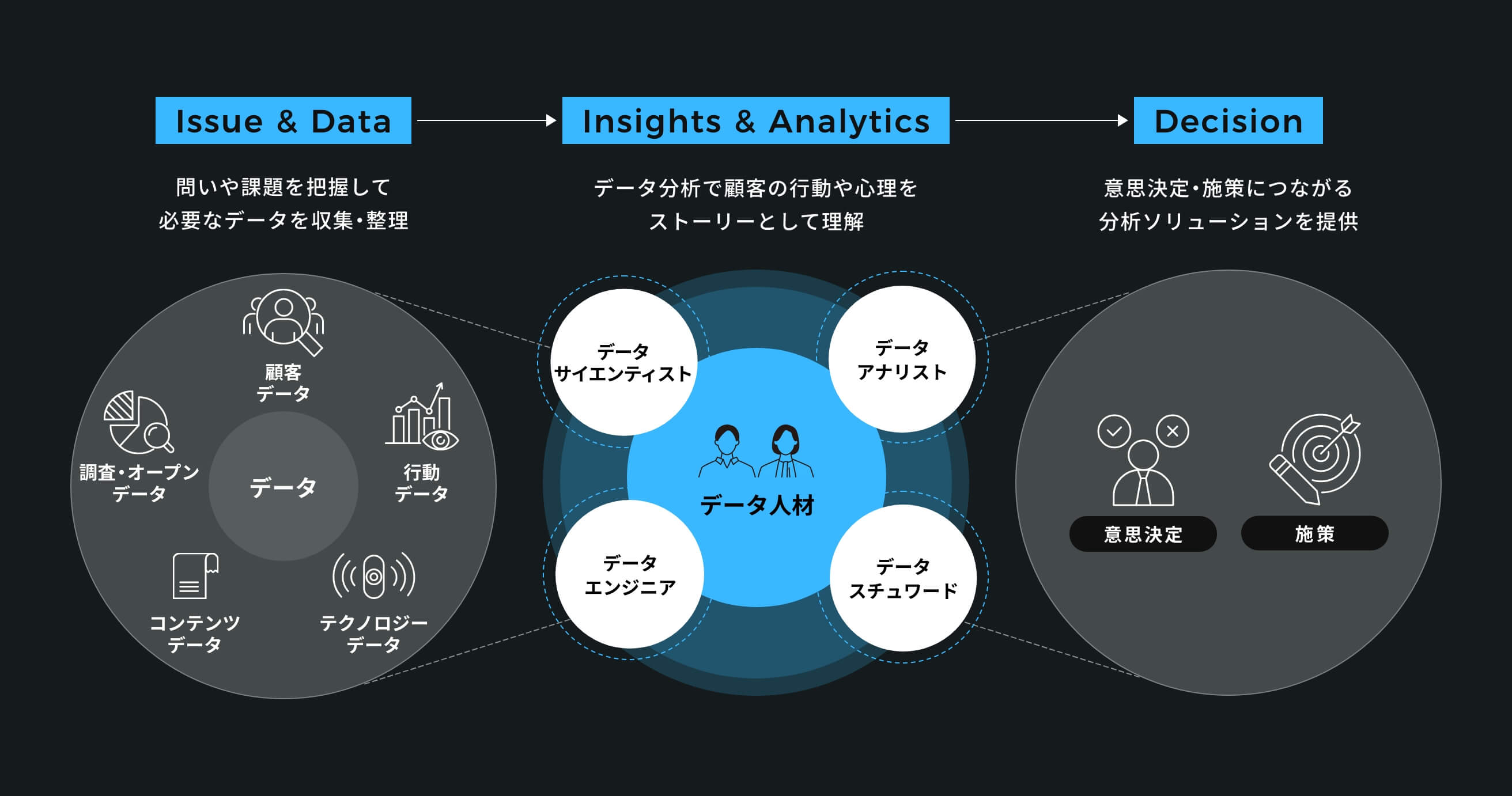 課題を起点に必要なデータやアプローチを設計。分析を通じて意思決定を支援する。