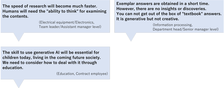 Another challenging issue pointed out was "how to ask questions to get better answers" (Automobile/Transportation equipment, Contract employee). In fact, while using ChatGPT to gather information, I actually experienced that the answers depend on how we put the question. Perhaps many people think it is only a matter of time before the AI's accuracy improves, and therefore, advancing their own skills for better utilization is the matter on the human side.